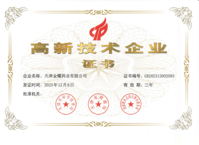 近日,集团旗下金耀药业公司通过国家高新技术企业复审认定,天津市科学技术局、天津市财政局、国家税务总局天津市税务局联合颁发《高新技术企业证书》。
